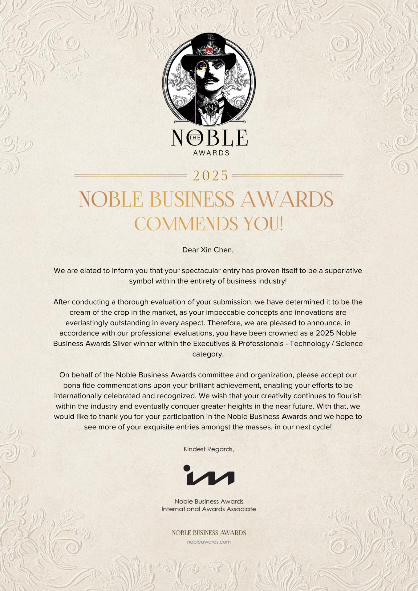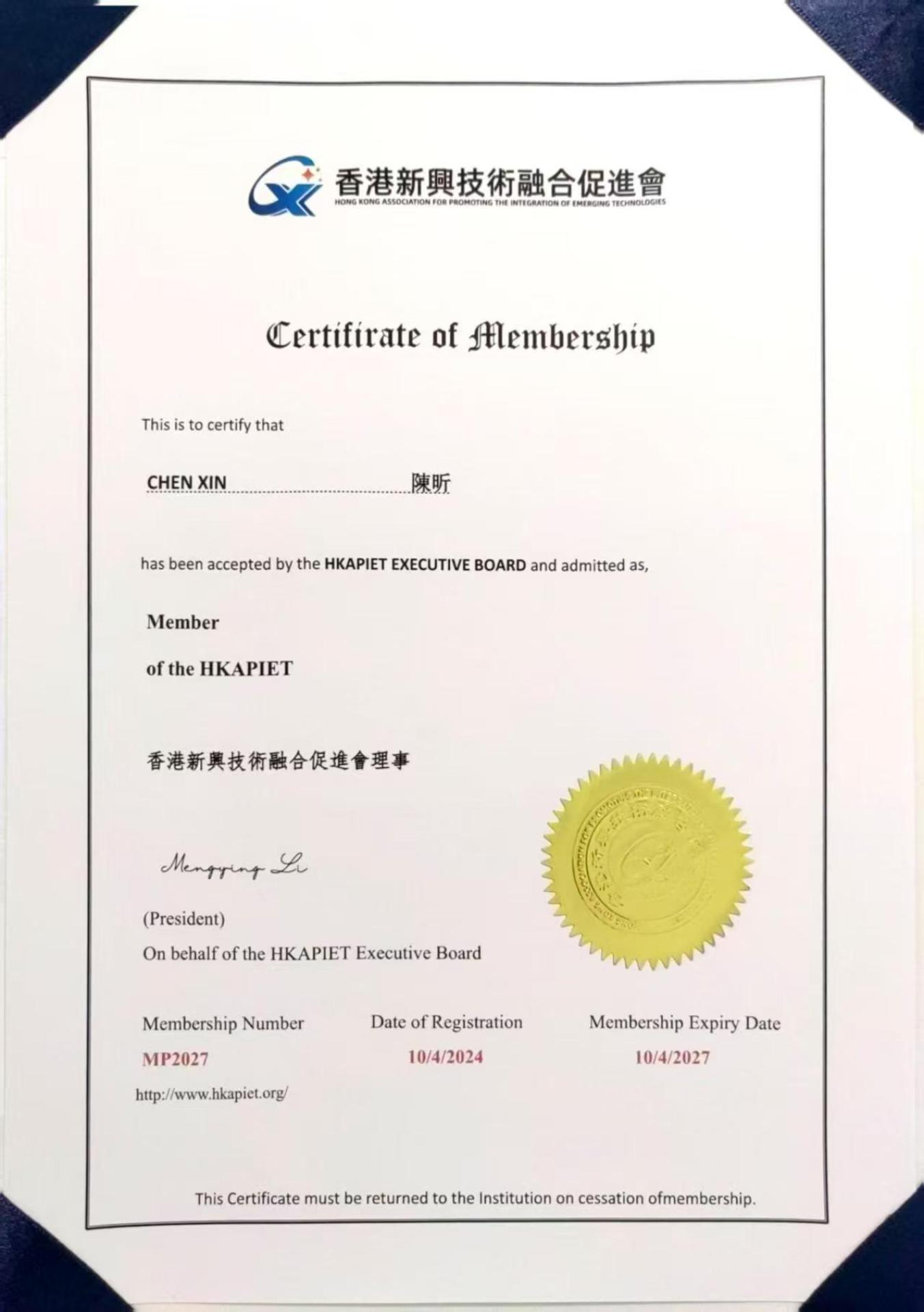 Over the past 1–3 years, Chen Xin has achieved remarkable results in technical innovation, industry recognition, and professional influence. In terms of research, he developed the "Electronic Engineering Management Responsibility Traceability System Based on Blockchain Technology V1.0" in March 2023 and the "Digital High-precision Electrical Parameter Testing Data Management System Based on Big Data V1.0" in January 2022, advancing intelligent and data-driven solutions in electronic engineering. He has been honored with prestigious awards, including the 2024 Most Economically Valuable Achievement Award in Electronic Technology, 2024 Outstanding Leader in Electronic Engineering Economic Development, 2023 Electronic Engineering Industry Innovation Outstanding Invention Achievements, and the 2025 Noble Business Awards Silver in the Executives & Professionals - Technology/Science Category. Additionally, he took on important social roles, such as becoming Advanced Talent Visiting Professor at Qingbei Craftsman Research Institute and Director of the Hong Kong Association for the Promotion of Emerging Technology Integration in April 2024. He was also featured in multiple industry media reports, sharing insights on electronic engineering trends, and served as Chairman of the Evaluation Committee for innovation challenges and expert consultant for precision measurement platforms, driving industry innovation practices.
